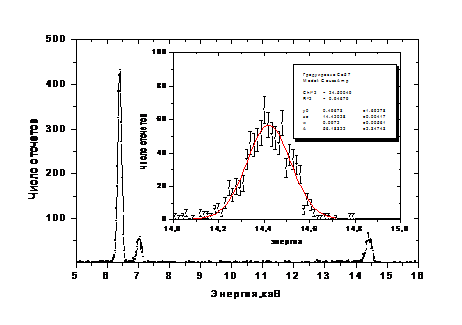 со средним 8.4 кэВ и дисперсией 0.65 кэВ. Результаты фита, соответствующего