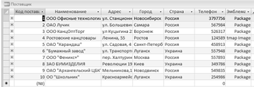 содержит код поставщика, наименование, адрес, город, страну, телефон и эмблему,