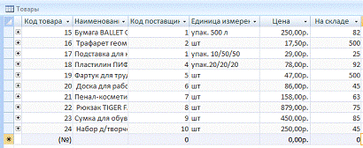 данных "Склад канцтоваров", содержащая всю необходимую информацию о