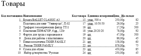 информацию о данных товарах, содержит информацию: код поставщика, наименование,