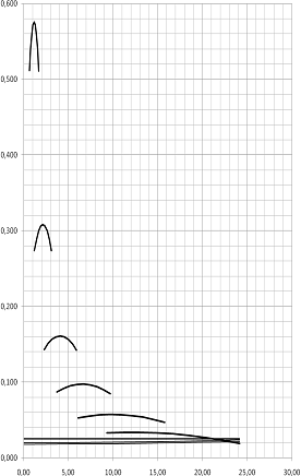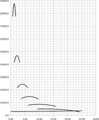 Разбиваем интервал скоростей на 7 участков и находим длину выбега