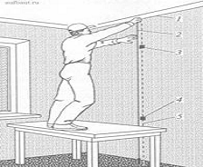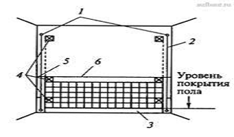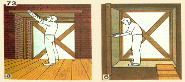 линейке с делениями, закрепляет ее на уровне стены, отмеряя местонахождение