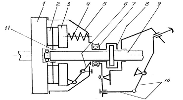 рычаги 10 через подшипник 7, систему рычагов 6 отводят нажимной диск 3 и диски