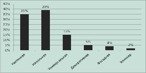 (39%), настенная (35%), универсальная (15%), фасадная (4%), клинкер (2%); в