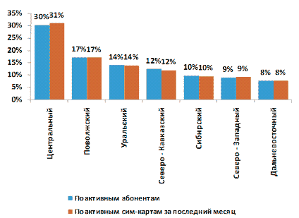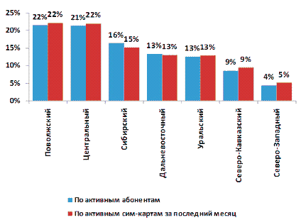 сотовой связи в России, а также изменение долевого распределения региональных