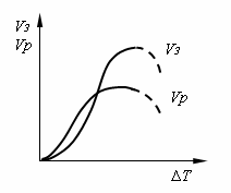 Vз и скорости роста кристаллов Vр в зависимости от степени переохлаждения ∆Т