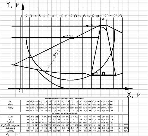 Заложение откосов плотины: верхового - m = 2, низового - m = 2