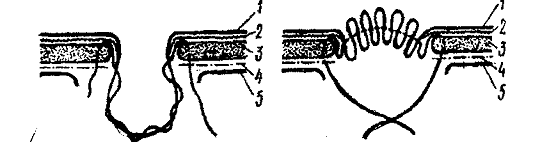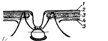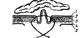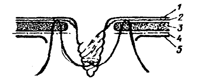 - мышечно-апоневротический слой; 4 - желтая брюшная фасция; 5 - кожа