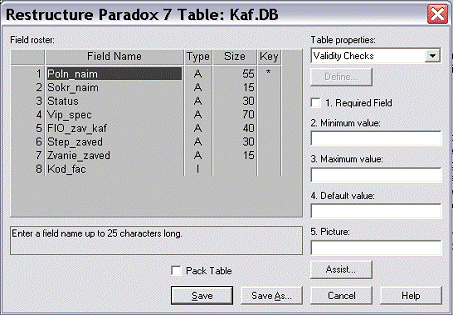 Change - осуществляет фильтрацию Таблицы1(“Kaf. db ”) по полю Код факультета (начиная с минимального значения).
