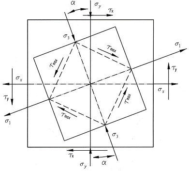 площадках, наклоненных под углом 45° к главным, и направлены в сторону σ1 (см. рис.