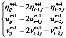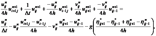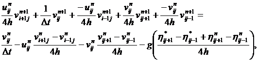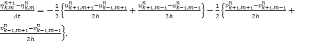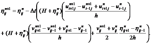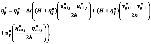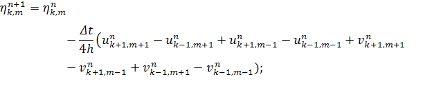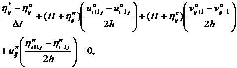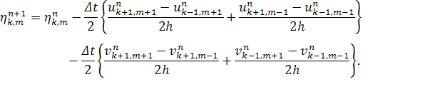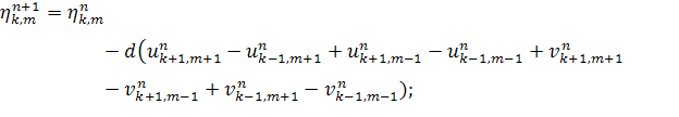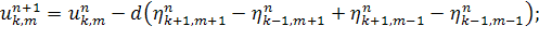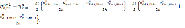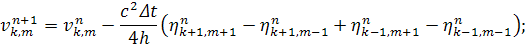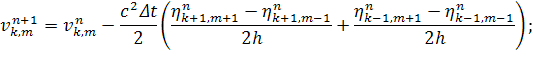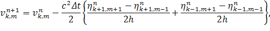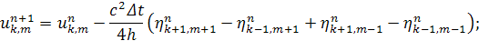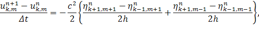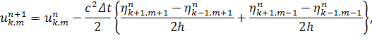 конечно-разностную схему в которой: c - фазовая скорость, u и v -векторы скорости, а η