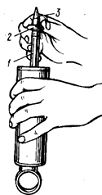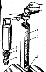цилиндр, в котором перемещается поршень с тарированными отверстиями, величина и