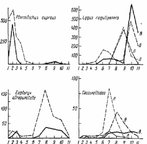 достигли прежней численности. У некоторых доминирующих видов жужелиц (Pterostichus