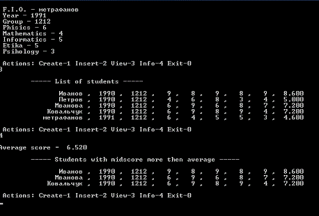 sum);(«\n\t - Students with midscore more then average -\n»);(Ft, "\n\t -