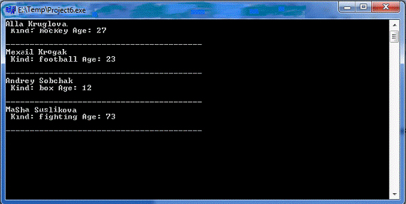 {:* name; // фамилия и инициалы* kind; // вид спортаage; // возраст: