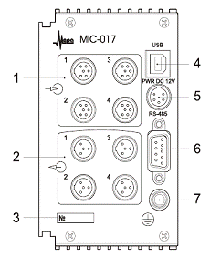 выходные (2) разъемы каналов, разъем питания (5), разъемы интерфейсов USB (4) и