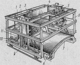 открывающимися бортами, каретки, служащей для горизонтального перемещения