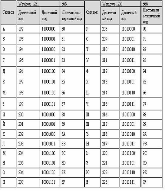 Таблица 2 Коды символов по Windows 1251 и 866 [5]