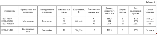 Основные технические данные зажимов и блоков приведены в табл. 1.