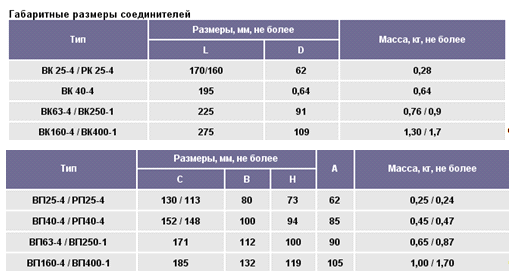 Технические данные соединителей: