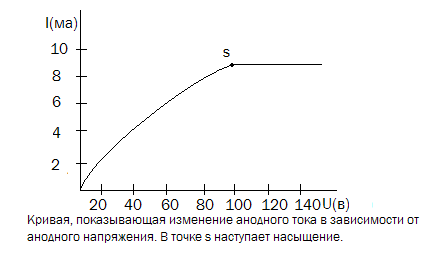 увеличении напряжении на аноде, анодный ток в лампе достигает предела. На