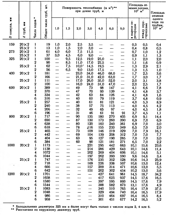 Параметры кожухотрубчатых теплообменников и холодильников (по ГОСТ