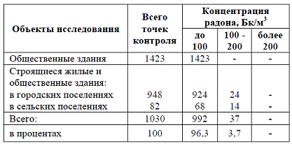 установлена в 96,3% обследованных зданий, 100-200 Бк/м3 - в 3,7%.