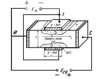 толщины р-п перехода и уменьшению токопроводящего сечения канала.