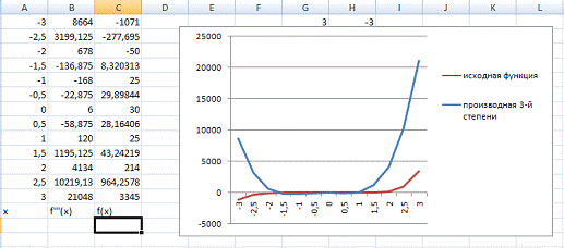 производной 3-й степени на заданном участке и полученная информация выводится
