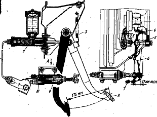 выключения сцепления, отвернув две гайки, крепящие его к кронштейну педалей, и
