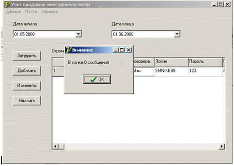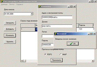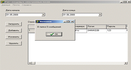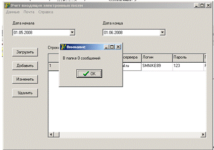 окно - установление связи с почтовым сервером для проверки писем. Далее следует