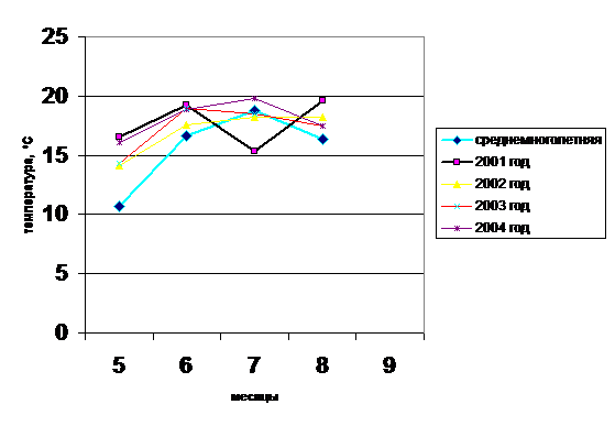 Среднемесячная температура воздуха за 2001- 2004 года в сравнении со