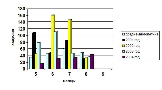 Атмосферные осадки по месяцам за 2001 - 2004 годы в сравнении со