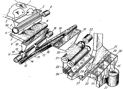 собирают в бункере 28 и далее подают вибрационным дозирующим транспортером 27