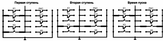 реостата и необходимые выдержки реле времени K7, K8 для обеспечения пуска.