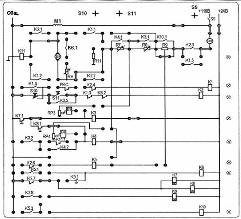 кнопки S11. Контактом K2.3 подаётся питание на якорь двигателя (+110В, S9, PA1,