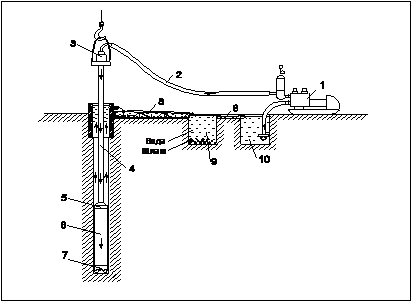 буровой насос; 2 - нагнетательный шланг; 3 - вертлюг - сальник; 4 - колонна