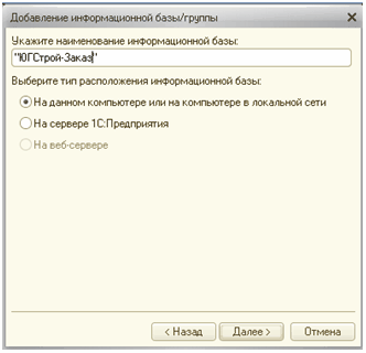 Затем следует указать имя создаваемой информационной базы (рисунок 2.5).