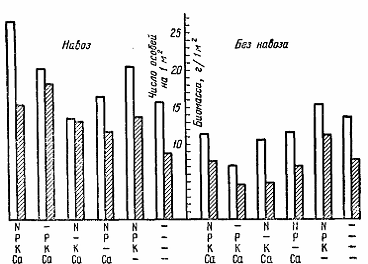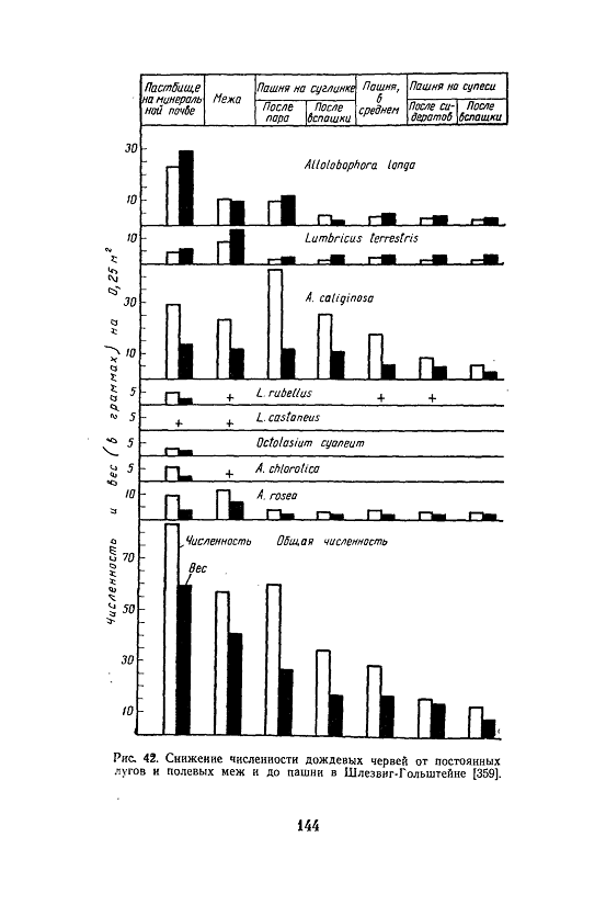 столбики) и биомасса (заштрихованные столбики) дождевых червей на различно