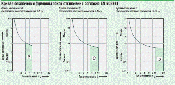 Диаграмма отключения автоматических выключателей разных типов (закрашена