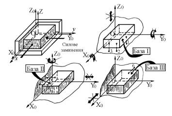Рис. 73. Теоретичні схеми базування заготовок типу тіл