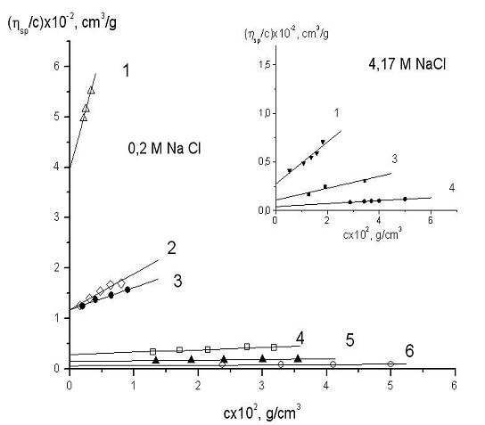 исследования вискозиметрии в 0,2 М NaCl и в 4,17 М NaCl по Хаггинсу