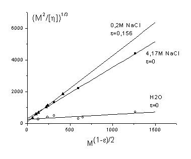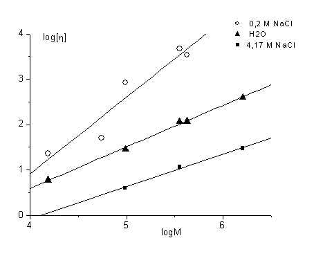 Рис.6 - зависимости [h]~M в 0.2M NaCl ([h]~M0.9), в 4,17