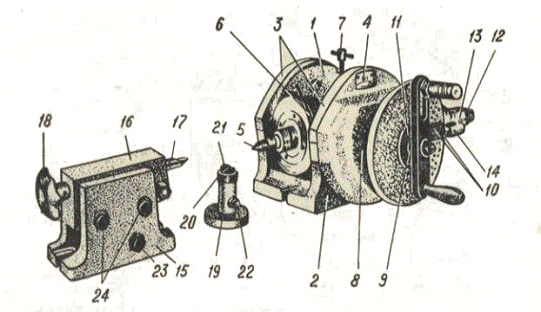 Делительный диск фиксируется в требуемом положении стопором 17. Центр задней