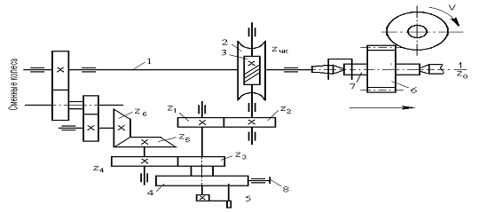 и с помощью гитары сменных зубчатых колес z\, zj, z3 и z4 связывают шпиндель 9