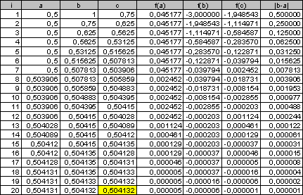 отрезка локализации корня пополам.
