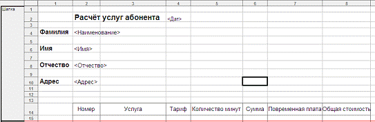 часть документа. Пример расчета стоимости услуг абонента, заполненной