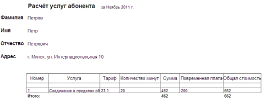 за который рассчитывается стоимость услуг абонента и данные об абоненте