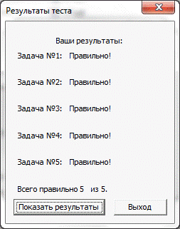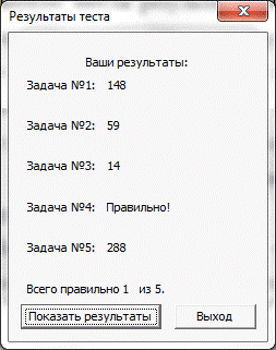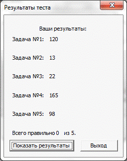пять заданий и предлагает ввести пользователю ответ. После окончания
