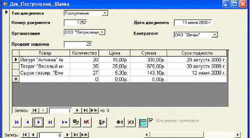 Далее происходит запись документа. При нажатии кнопки Провести вызывается